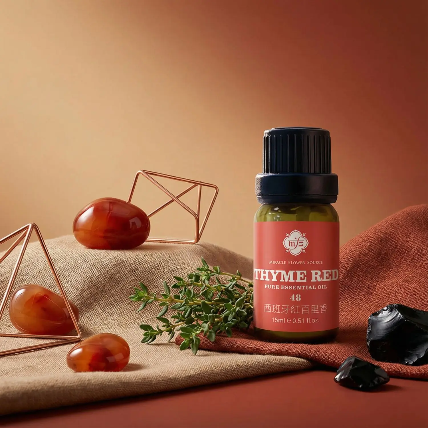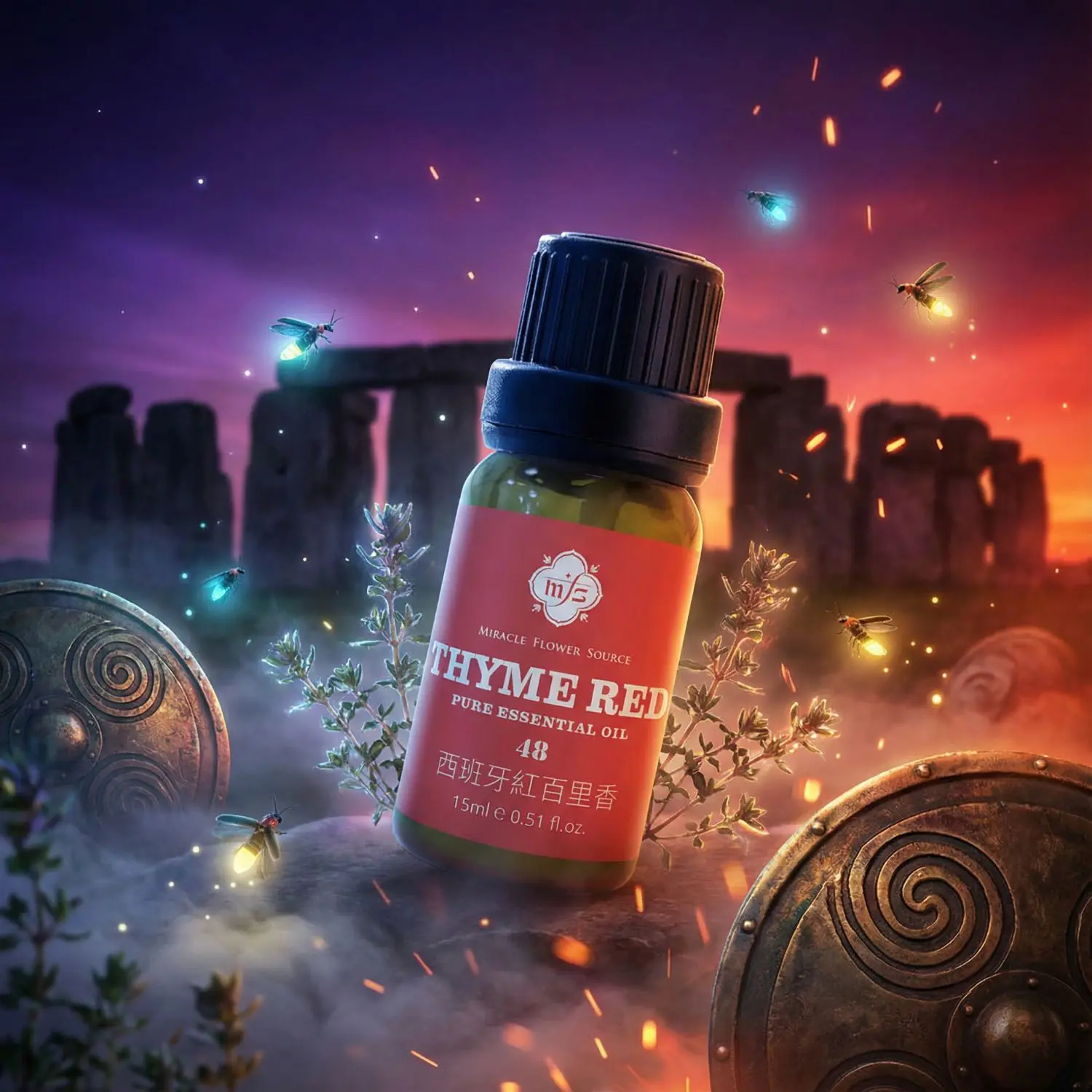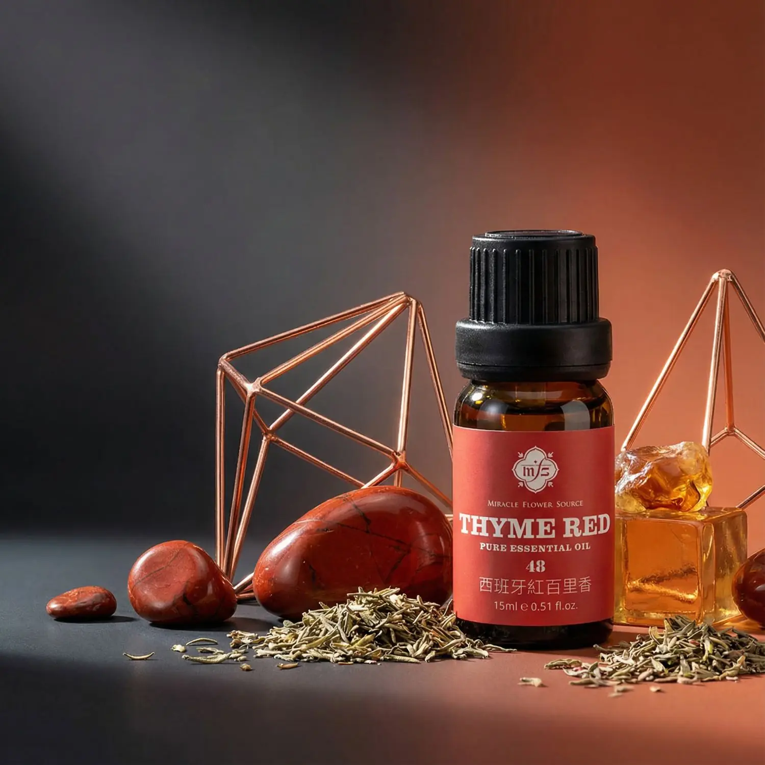 因其生長環境嚴苛,植物必須合成高比例的酚類物質(如百里香酚)來自我保護。其「紅」百里香之名源於初次蒸餾時,精油與蒸餾罐中的金屬離子反應而呈現出的深紅色澤,象徵著其所蘊含的強大生命力與火元素能量。